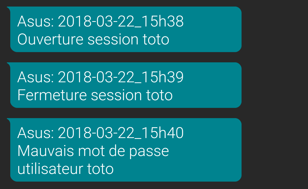 Je me sers de ce script pour “fliquer” un peu l'utilisation de ma machine personnelle qui est sous Linux. Je reçois donc un SMS quand l'un des événements suivants se produit: